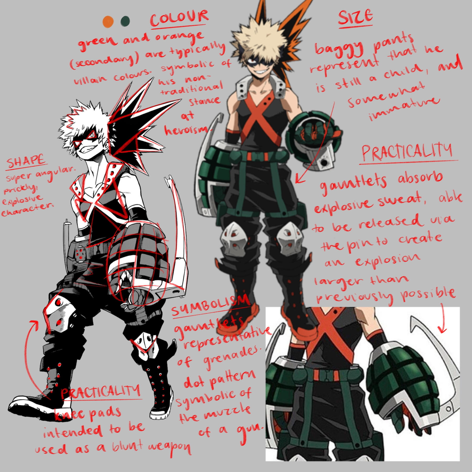 Bakugou Katsuki, one of the main characters in Horikoshi Kouhei’s My Hero Academia, is a great example of the crossover of practicality and symbolism. He is (literally) a super volatile character, with explosive sweat to accompany his unstable temperament. Clad in black, orange and green, Bakugou boasts colours that are traditionally reserved for villains, demonstrating his unusual approach to heroism. Huge gauntlets shaped like hand grenades provide not only a visual aid for the character’s abilities - the gauntlets soak up the sweat, storing it to provide the ability for much bigger explosions that are not possible for Bakugou to produce without aid. Excess sweat is stored in actual hand grenades that sit on a belt around his waist. Bakugou’s costume integrates symbolism with fashion. Circular patterns that emulate the muzzle of a gun are repeated in the neck brace, knee pads, and the hand grenades, but it’s also found in the shoes - one of the costume’s more street-style aspects. Overall, Bakugou’s costume is an impressive intersection of the many aspects of design, coming together for a perfect depiction of the character himself.