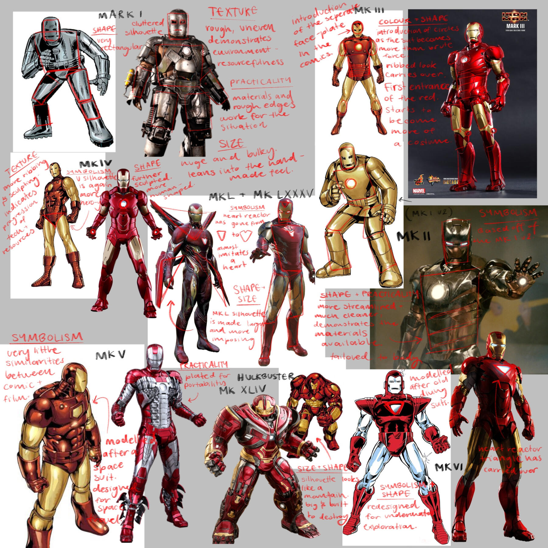 The development of his suit is a huge part of Iron Man’s storyline, going all the way from mark I to mark LXXXI. Overall, Iron Man is a pretty rectangular character, with circular and triangular accents that vary from mark to mark. The mark I is a grey suit made of scrap metal, built both to keep Tony Stark alive, and help him escape from forgein captivity. This is upgraded to the mark II once he makes it home. The mark III and IV are more fitted, and see the introduction of separate faceplates, repulsors, and red panels on the suit. The mark V differs a lot between the comic and film iterations, with the comic suit modelled after a spacesuit, while the mark V in the film is a lightweight, grey and red suit. The mark VI suits also have few comic-movie similarities apart from their underwater capabilities, but we do see the introduction of the triangular reactor. As the progression continues from mark L to LXXI, there are few major differences, apart from slight changes in colour, silhouette, and aptitude. All in all, Iron Man’s suits make use of texture, shape, and size to demonstrate the change in Iron Man’s story and character.